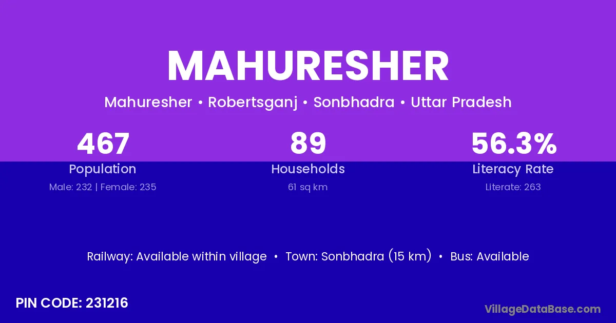 Sonbhadra (15 km) is the nearest town to Mahuresher village for major economic activities and is located approximately 15 km away.