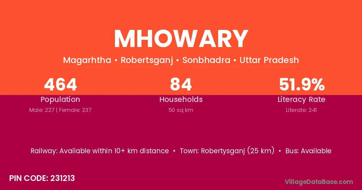 Robertysganj (25 km) is the nearest town to Mhowary village for major economic activities and is located approximately 25 km away.