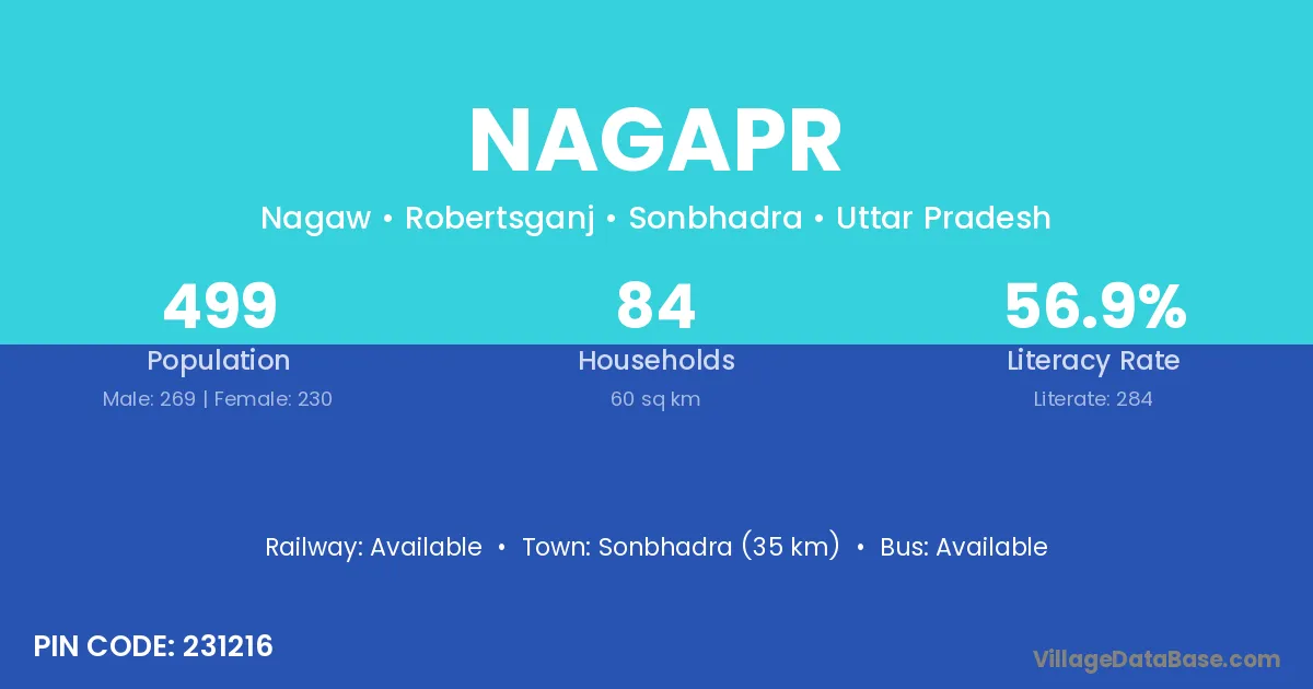Sonbhadra (35 km) is the nearest town to Nagapr village for major economic activities and is located approximately 35 km away.