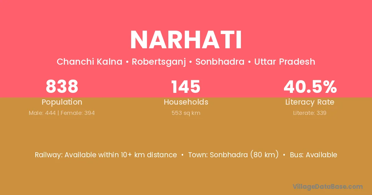 Sonbhadra (80 km) is the nearest town to Narhati village for major economic activities and is located approximately 80 km away.