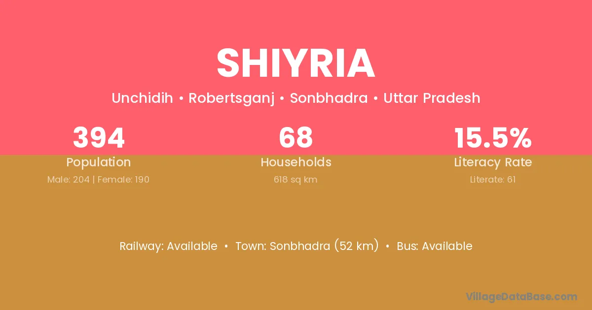 Sonbhadra (52 km) is the nearest town to Shiyria village for major economic activities and is located approximately 52 km away.