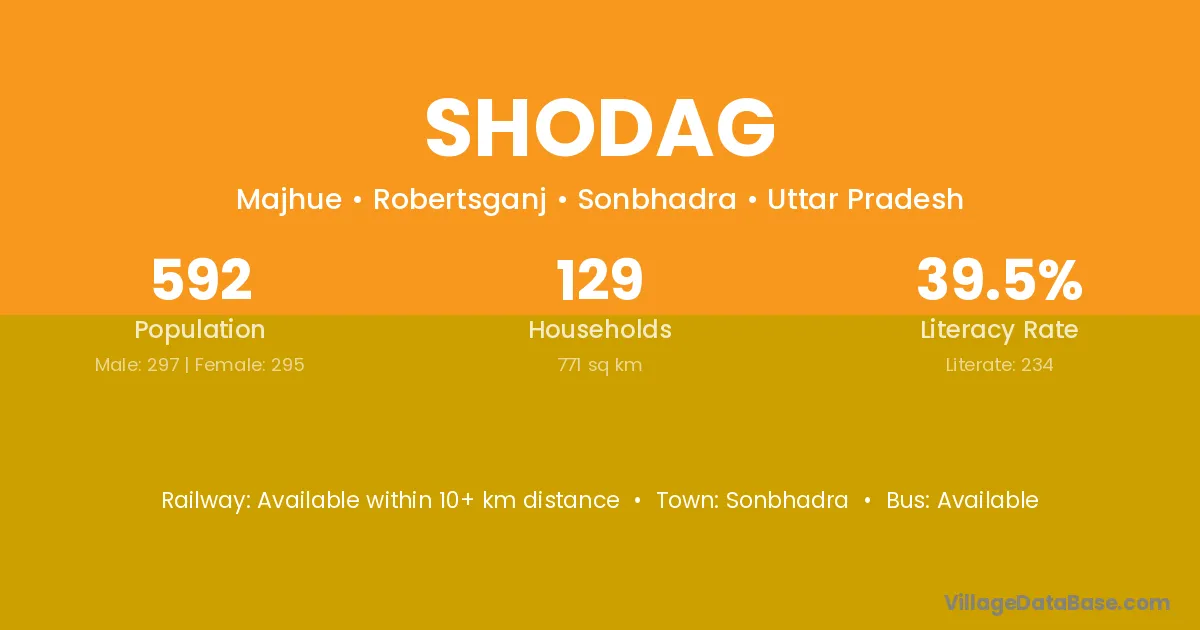 Shodag village has a total population of 592 people, of which 297 are males and 295 are females.