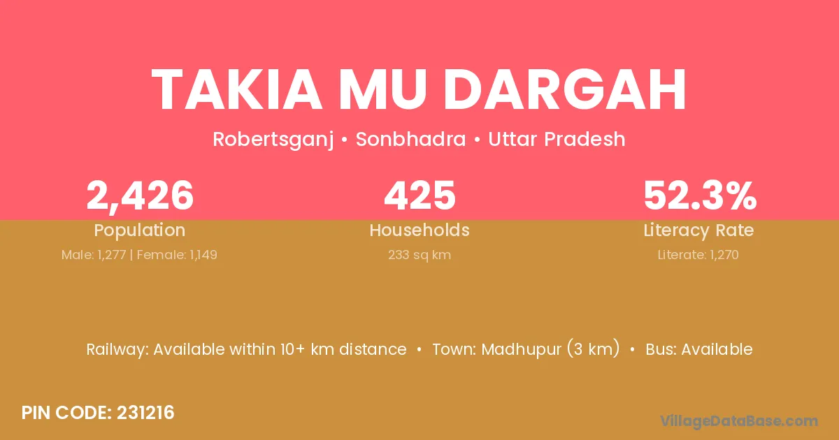 Takia Mu Dargah village has a total population of 2,426 people, of which 1,277 are males and 1,149 are females.