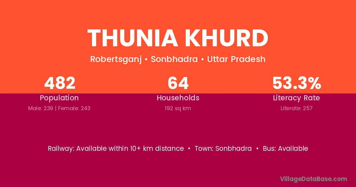 Thunia Khurd village has a total population of 482 people, of which 239 are males and 243 are females.