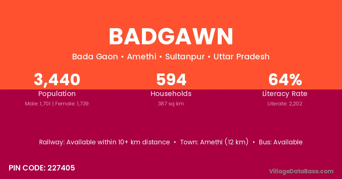 Amethi (12 km) is the nearest town to Badgawn village for major economic activities and is located approximately 12 km away.