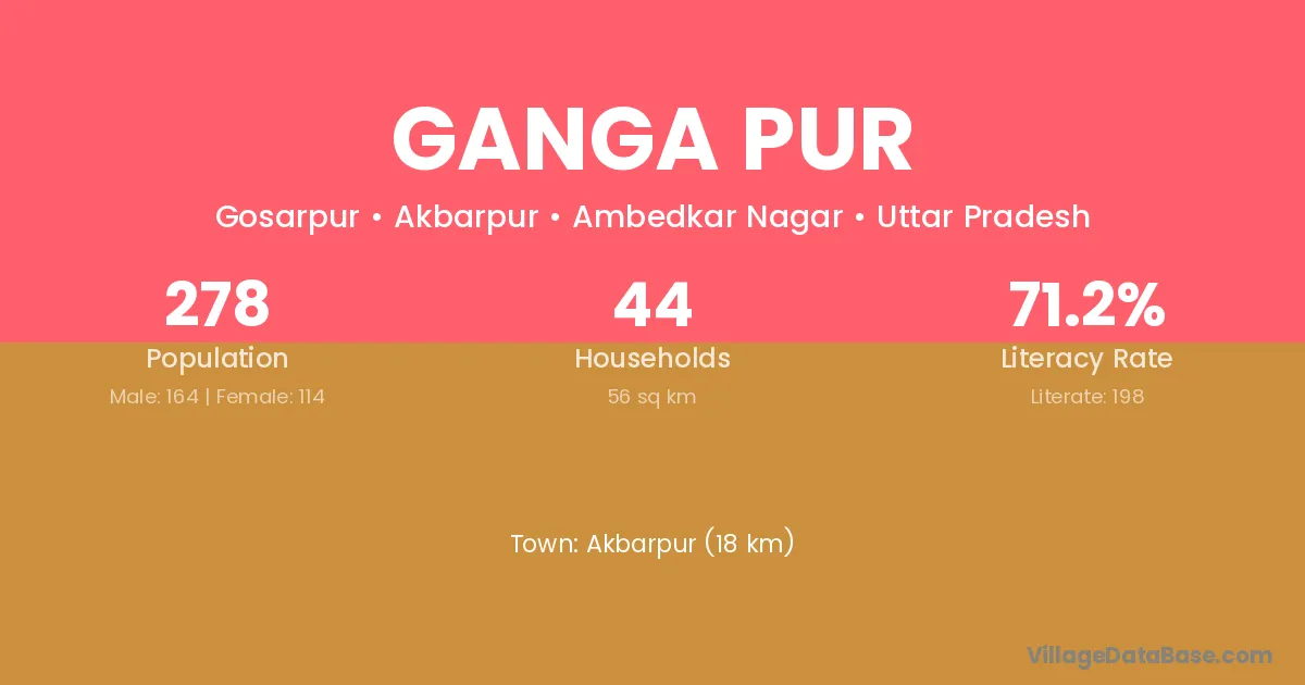 The literacy rate of Ganga Pur village is 66.22%. Male literacy stands at 77.18% and female literacy at 54.87%.