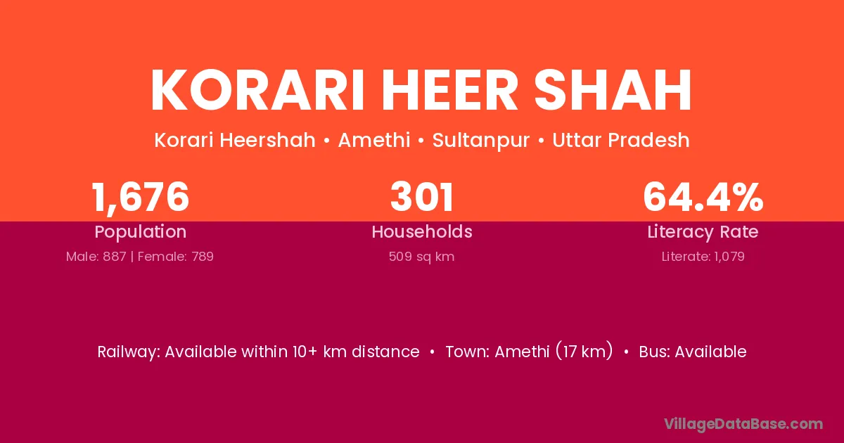 Amethi (17 km) is the nearest town to Korari Heer Shah village for major economic activities and is located approximately 17 km away.