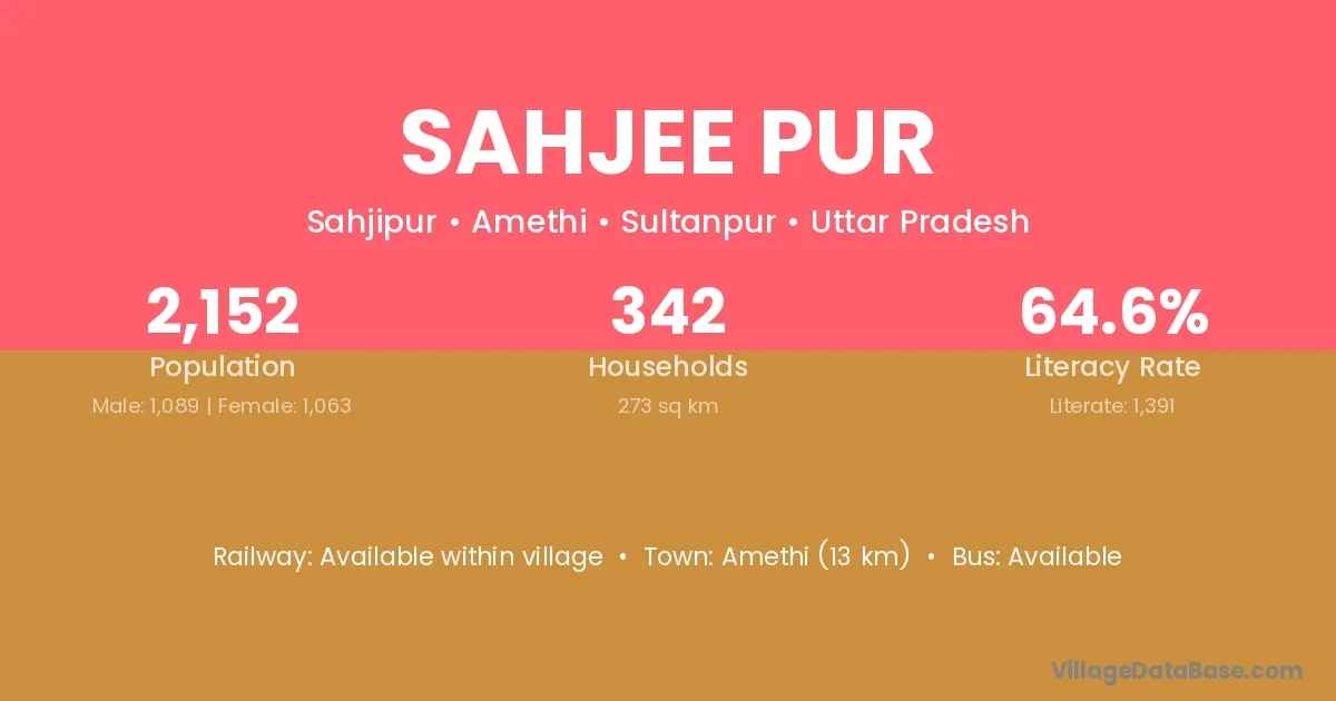 Amethi (13 km) is the nearest town to Sahjee Pur village for major economic activities and is located approximately 13 km away.