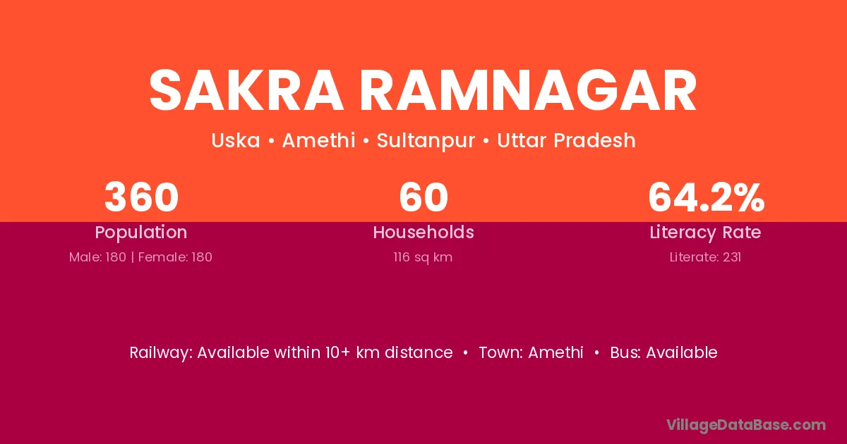 Sakra Ramnagar village has a total population of 360 people, of which 180 are males and 180 are females.
