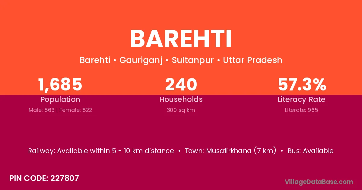 Musafirkhana (7 km) is the nearest town to Barehti village for major economic activities and is located approximately 7 km away.