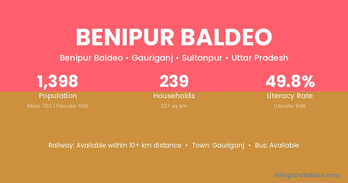 Benipur Baldeo village has a total population of 1,398 people, of which 702 are males and 696 are females.