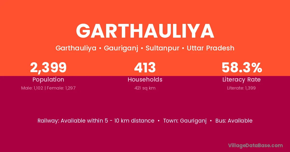 Garthauliya village has a total population of 2,399 people, of which 1,102 are males and 1,297 are females.
