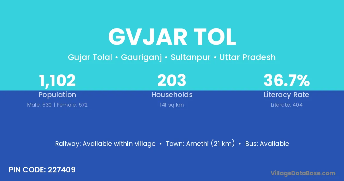 Amethi (21 km) is the nearest town to Gvjar Tol village for major economic activities and is located approximately 21 km away.
