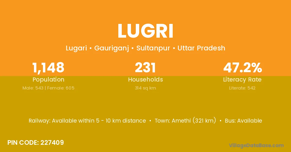 Amethi (321 km) is the nearest town to Lugri village for major economic activities and is located approximately 321 km away.