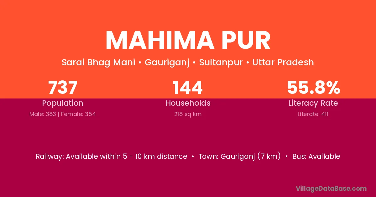Mahima Pur village has a total population of 737 people, of which 383 are males and 354 are females.