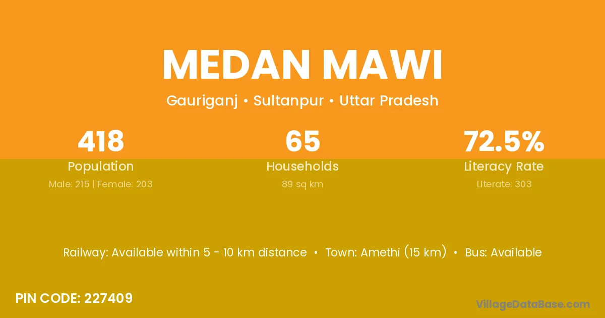 Amethi (15 km) is the nearest town to Medan Mawi village for major economic activities and is located approximately 15 km away.
