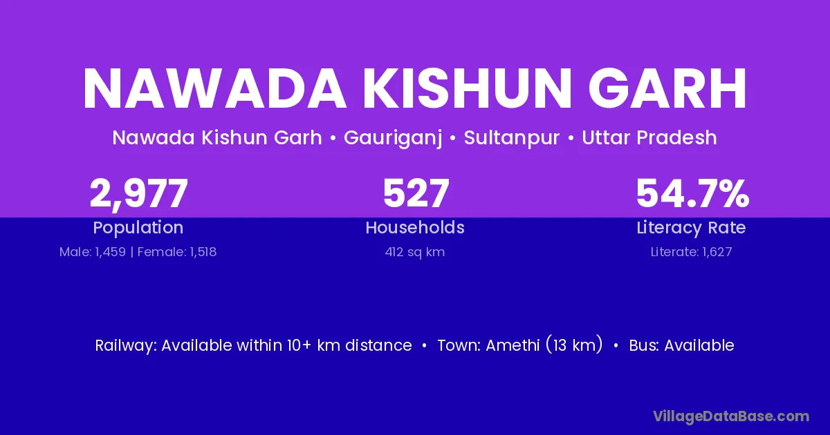 Amethi (13 km) is the nearest town to Nawada Kishun Garh village for major economic activities and is located approximately 13 km away.