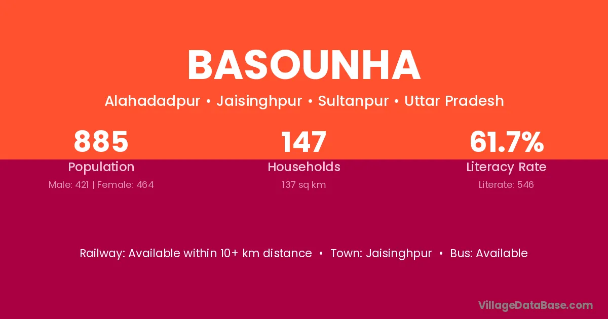 Basounha village has a total population of 885 people, of which 421 are males and 464 are females.