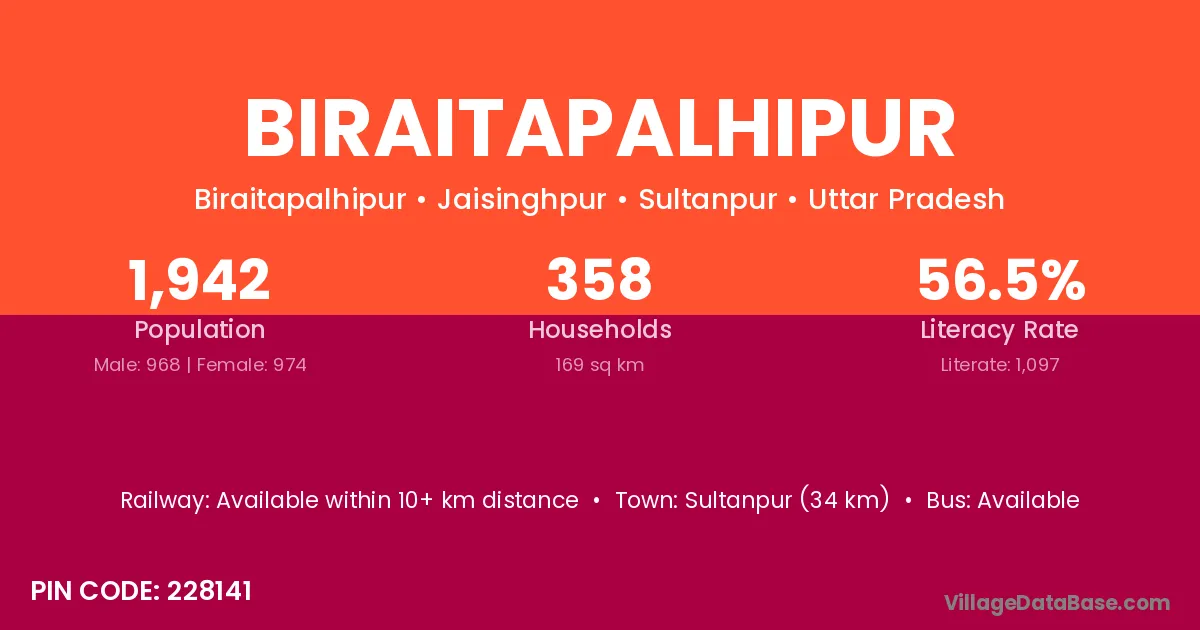 Sultanpur (34 km) is the nearest town to Biraitapalhipur village for major economic activities and is located approximately 34 km away.
