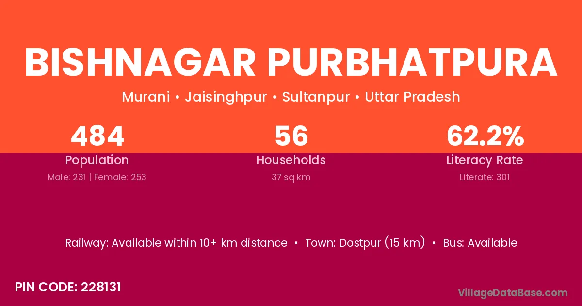 Bishnagar Purbhatpura village has a total population of 484 people, of which 231 are males and 253 are females.