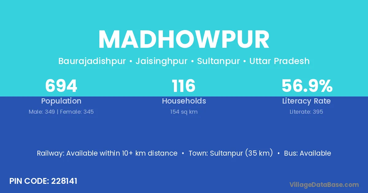 Sultanpur (35 km) is the nearest town to Madhowpur village for major economic activities and is located approximately 35 km away.
