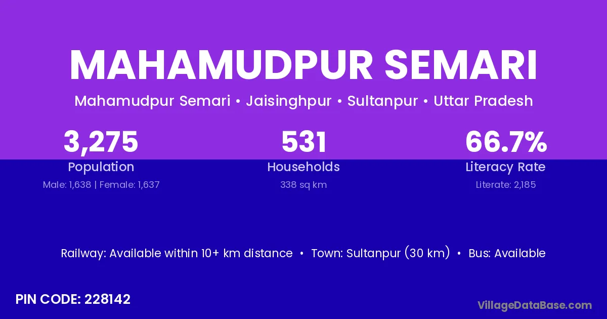 Sultanpur (30 km) is the nearest town to Mahamudpur Semari village for major economic activities and is located approximately 30 km away.