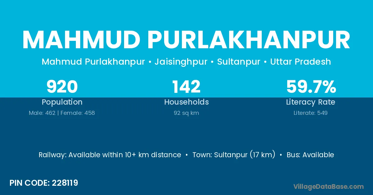 Mahmud Purlakhanpur village has a total population of 920 people, of which 462 are males and 458 are females.