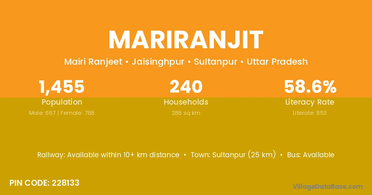 Sultanpur (25 km) is the nearest town to Mariranjit village for major economic activities and is located approximately 25 km away.