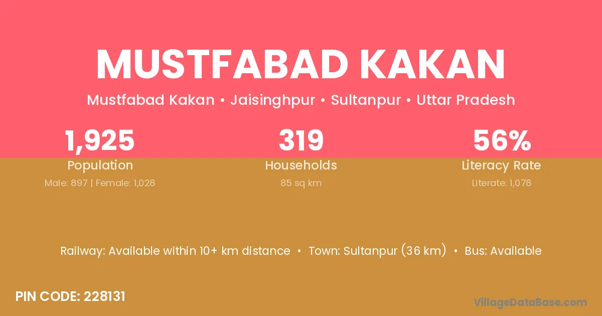 Sultanpur (36 km) is the nearest town to Mustfabad Kakan village for major economic activities and is located approximately 36 km away.