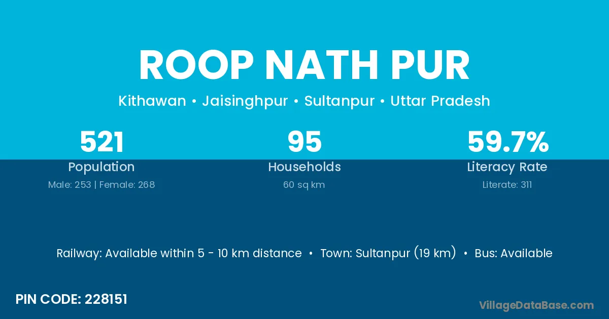 Sultanpur (19 km) is the nearest town to Roop Nath Pur village for major economic activities and is located approximately 19 km away.