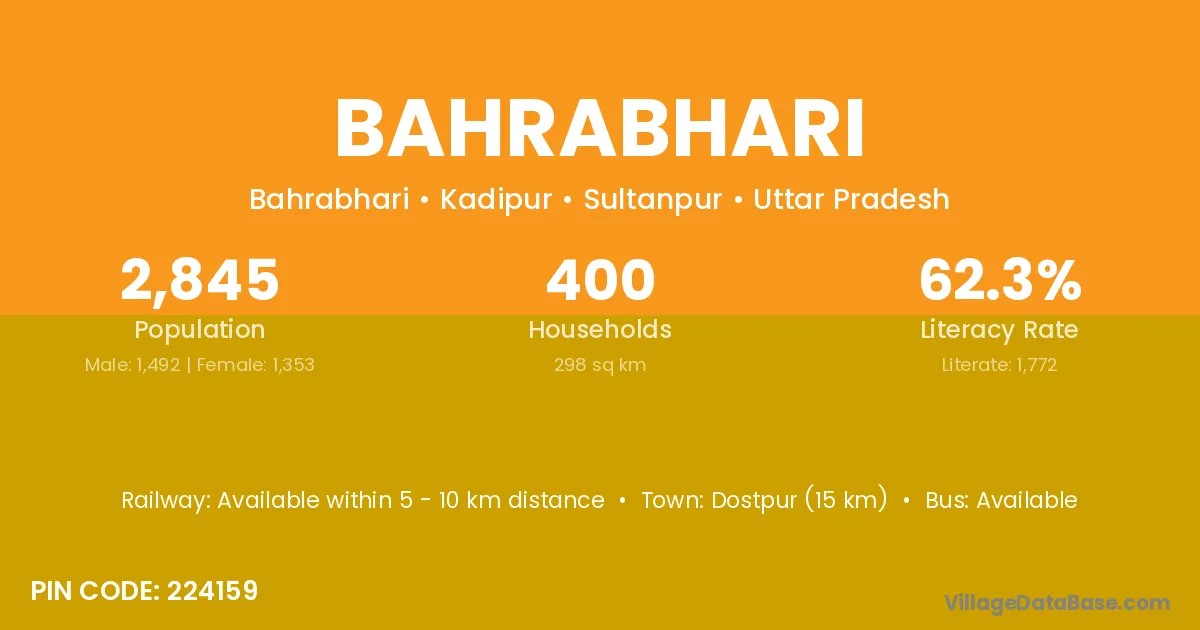 Dostpur (15 km) is the nearest town to Bahrabhari village for major economic activities and is located approximately 15 km away.