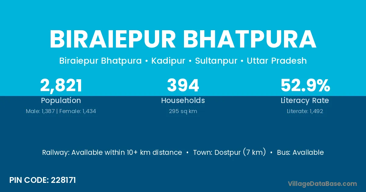 Dostpur (7 km) is the nearest town to Biraiepur Bhatpura village for major economic activities and is located approximately 7 km away.