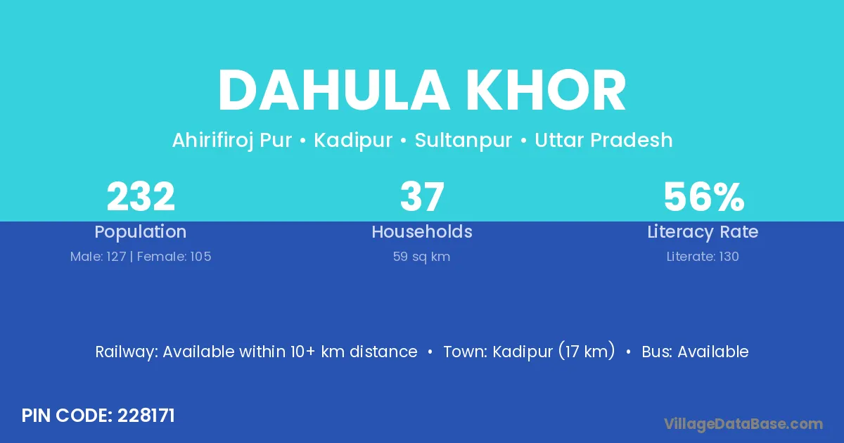 Kadipur (17 km) is the nearest town to Dahula Khor village for major economic activities and is located approximately 17 km away.