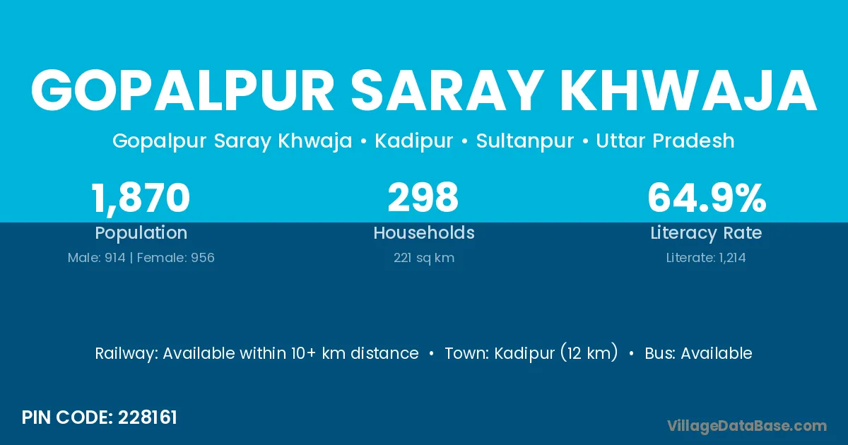 Kadipur (12 km) is the nearest town to Gopalpur Saray Khwaja village for major economic activities and is located approximately 12 km away.