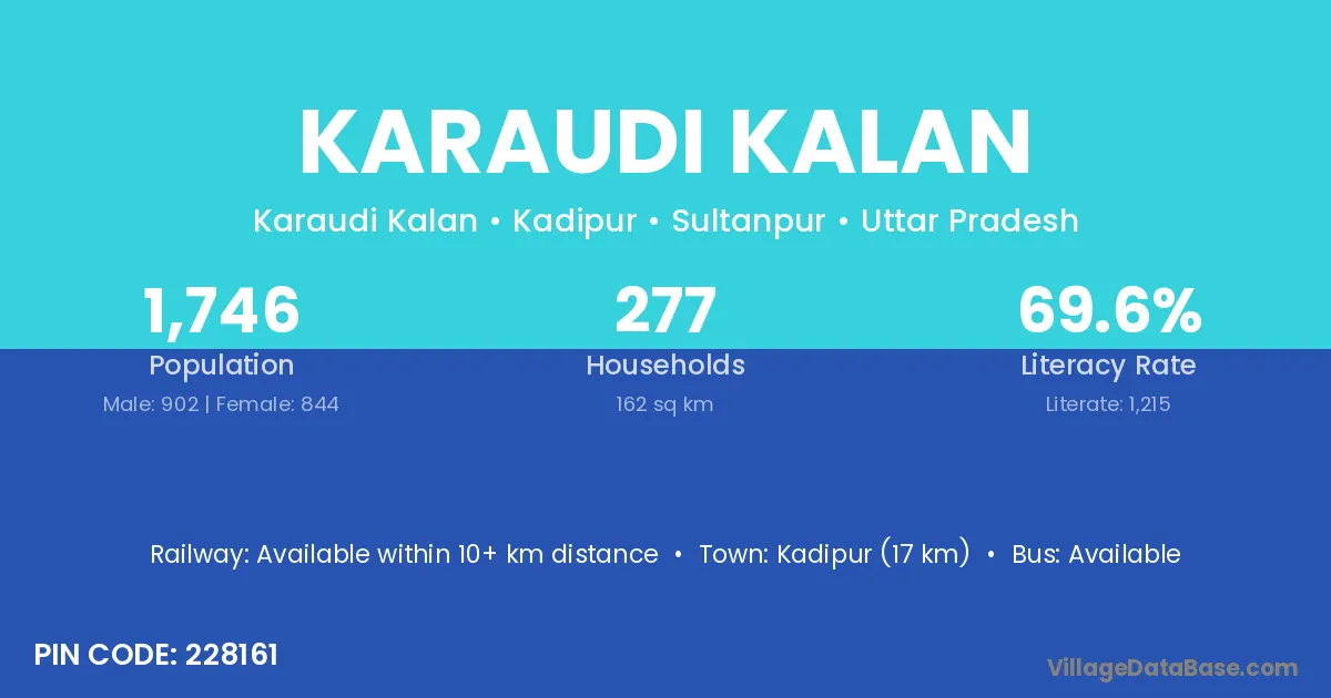 Kadipur (17 km) is the nearest town to Karaudi Kalan village for major economic activities and is located approximately 17 km away.