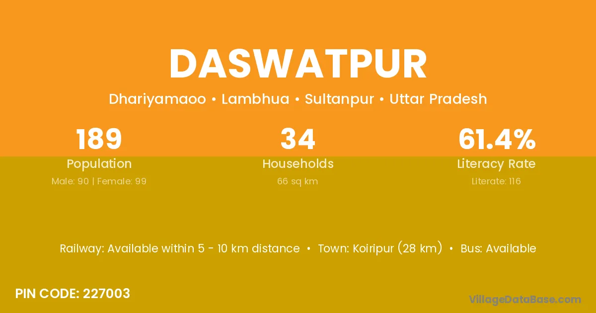 Daswatpur village has a total population of 189 people, of which 90 are males and 99 are females.