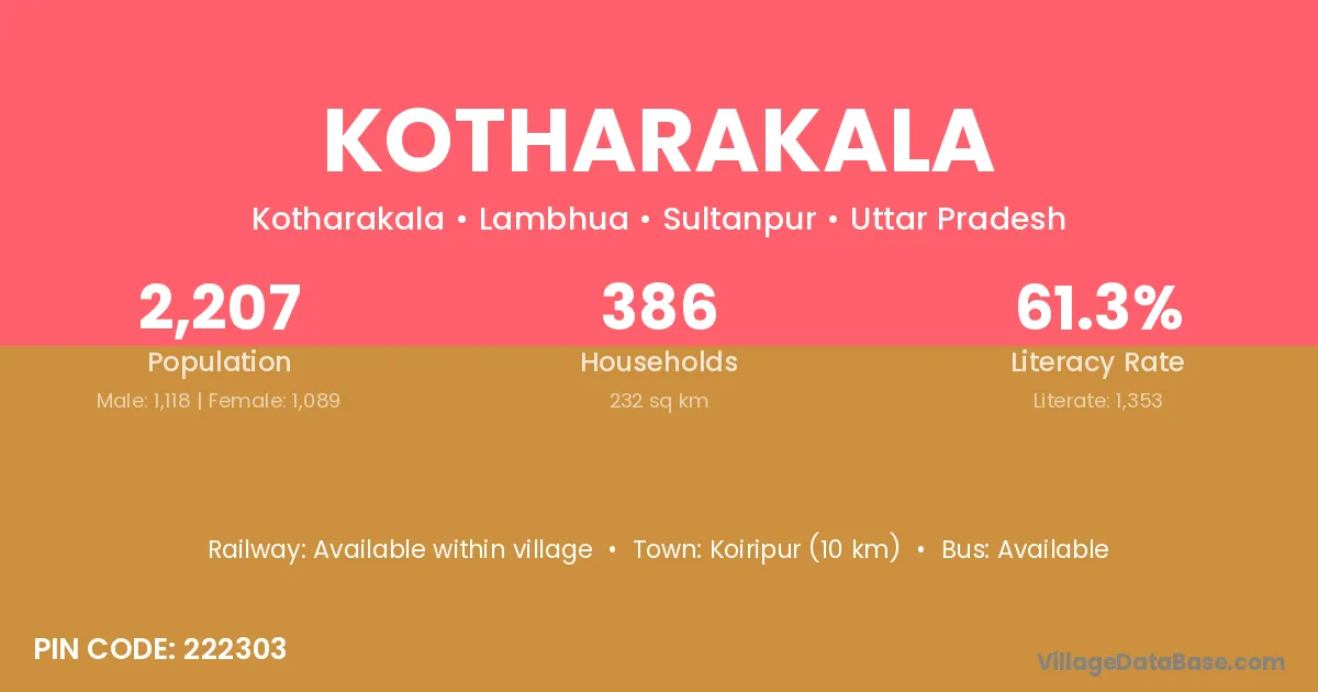 Kotharakala village has a total population of 2,207 people, of which 1,118 are males and 1,089 are females.
