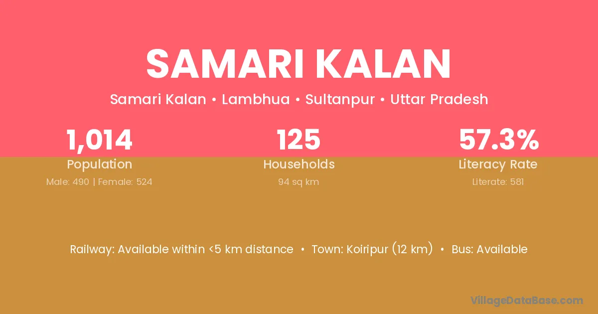 Koiripur (12 km) is the nearest town to Samari Kalan village for major economic activities and is located approximately 12 km away.