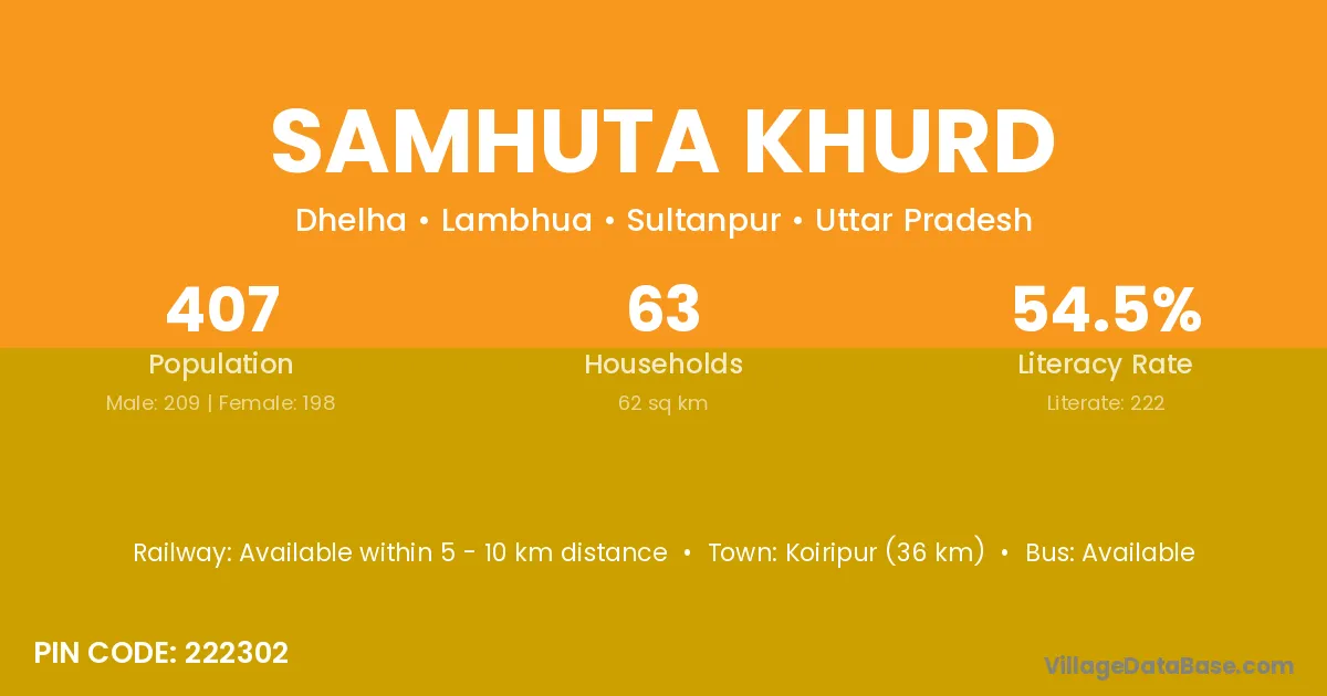 Samhuta Khurd village has a total population of 407 people, of which 209 are males and 198 are females.
