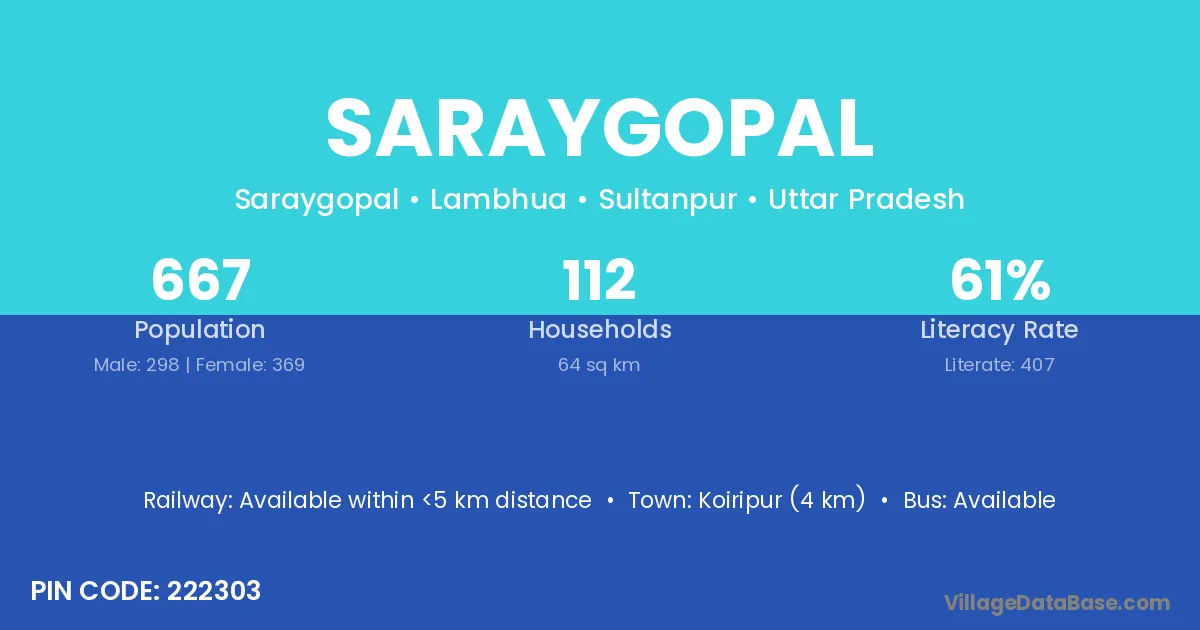 The literacy rate of Saraygopal village is 61.02%. Male literacy stands at 70.47% and female literacy at 53.39%.