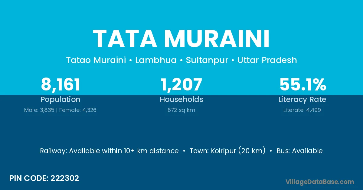 Tata Muraini village has a total population of 8,161 people, of which 3,835 are males and 4,326 are females.
