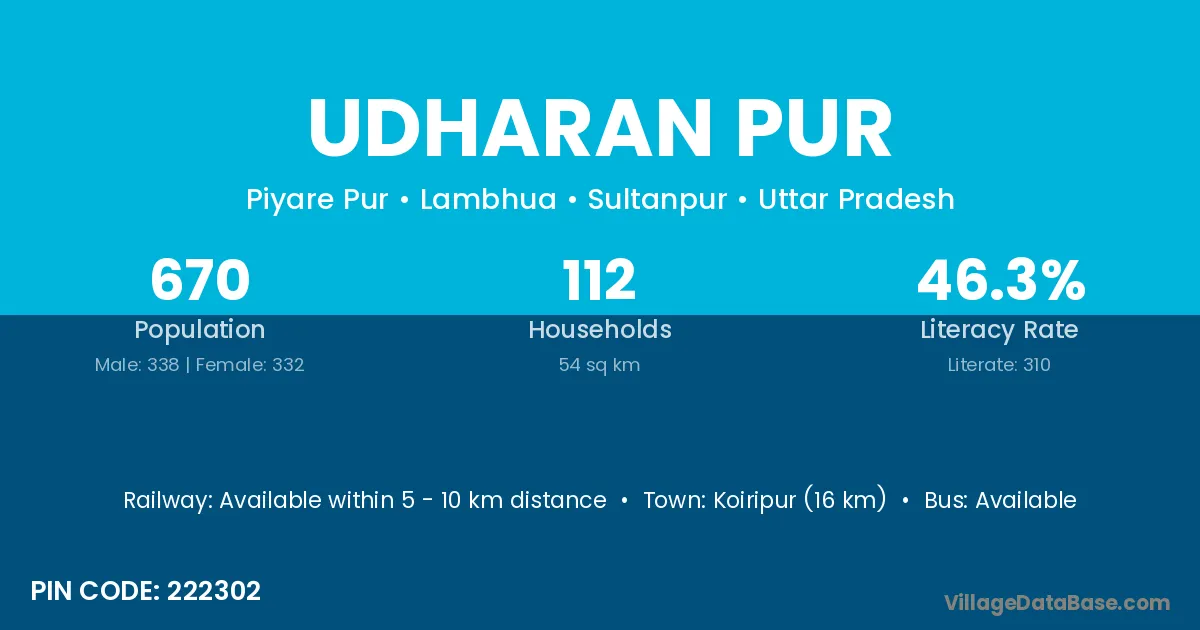 Koiripur (16 km) is the nearest town to Udharan Pur village for major economic activities and is located approximately 16 km away.