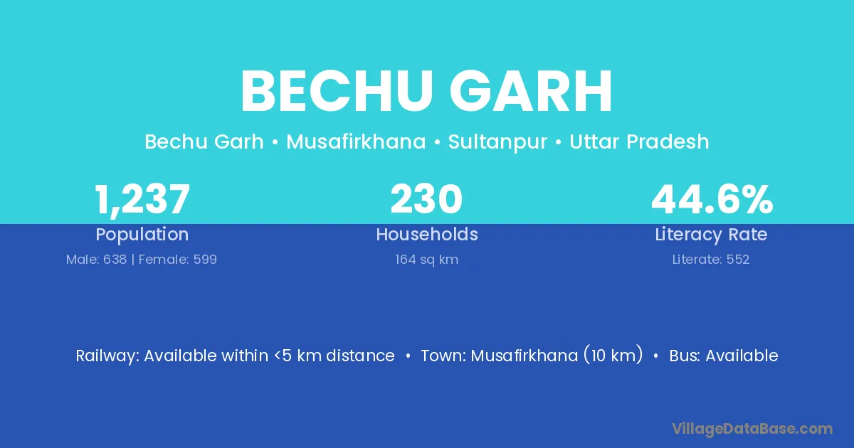 Bechu Garh village has a total population of 1,237 people, of which 638 are males and 599 are females.