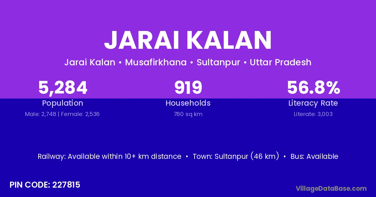 Sultanpur (46 km) is the nearest town to Jarai Kalan village for major economic activities and is located approximately 46 km away.