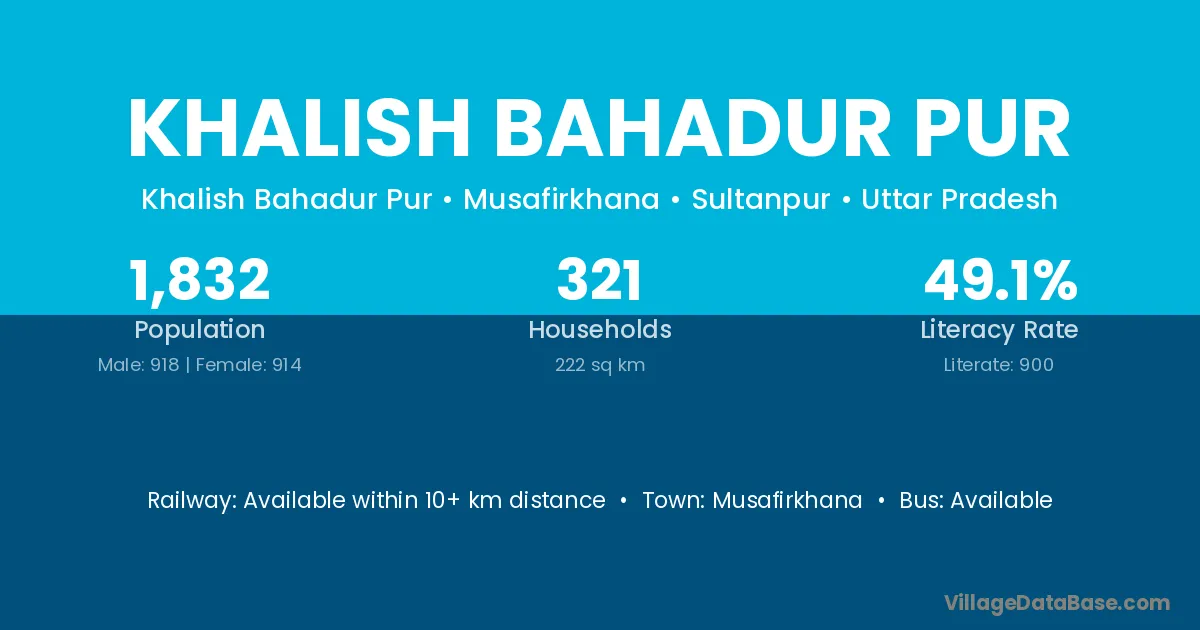 Khalish Bahadur Pur village has a total population of 1,832 people, of which 918 are males and 914 are females.