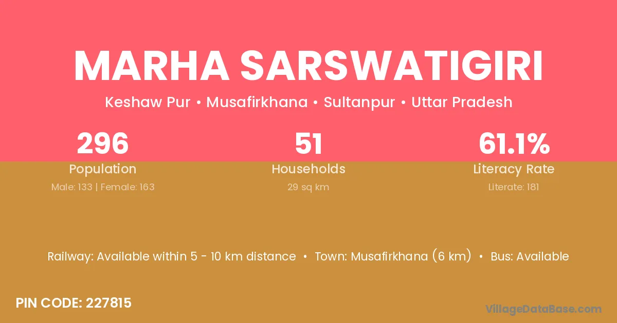 Musafirkhana (6 km) is the nearest town to Marha Sarswatigiri village for major economic activities and is located approximately 6 km away.