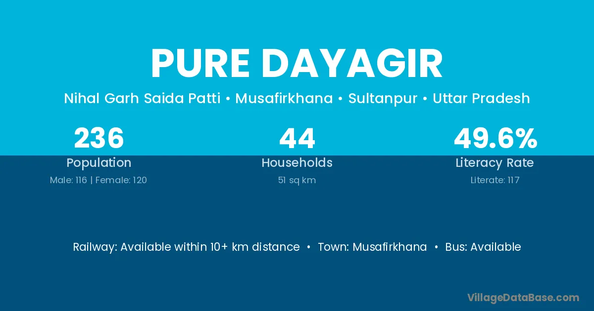 Pure Dayagir village has a total population of 236 people, of which 116 are males and 120 are females.