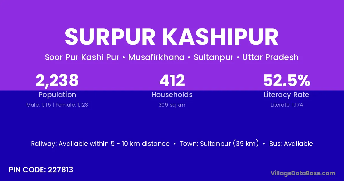 Sultanpur (39 km) is the nearest town to Surpur Kashipur village for major economic activities and is located approximately 39 km away.