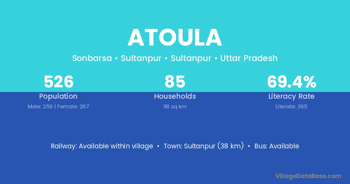 Sultanpur (38 km) is the nearest town to Atoula village for major economic activities and is located approximately 38 km away.