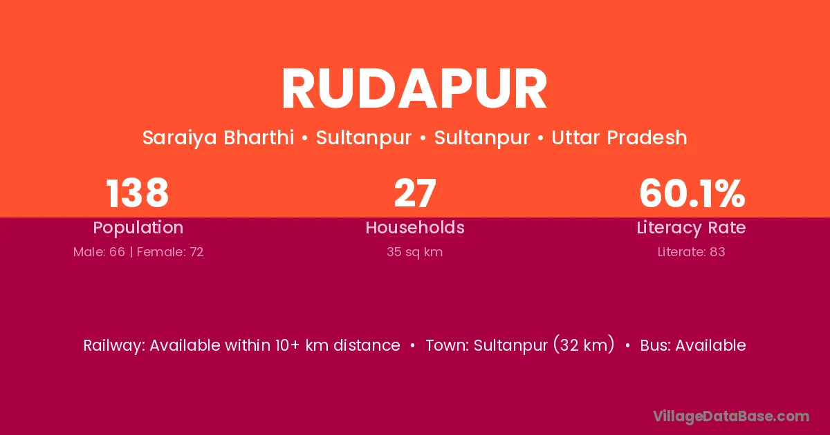 Sultanpur (32 km) is the nearest town to Rudapur village for major economic activities and is located approximately 32 km away.
